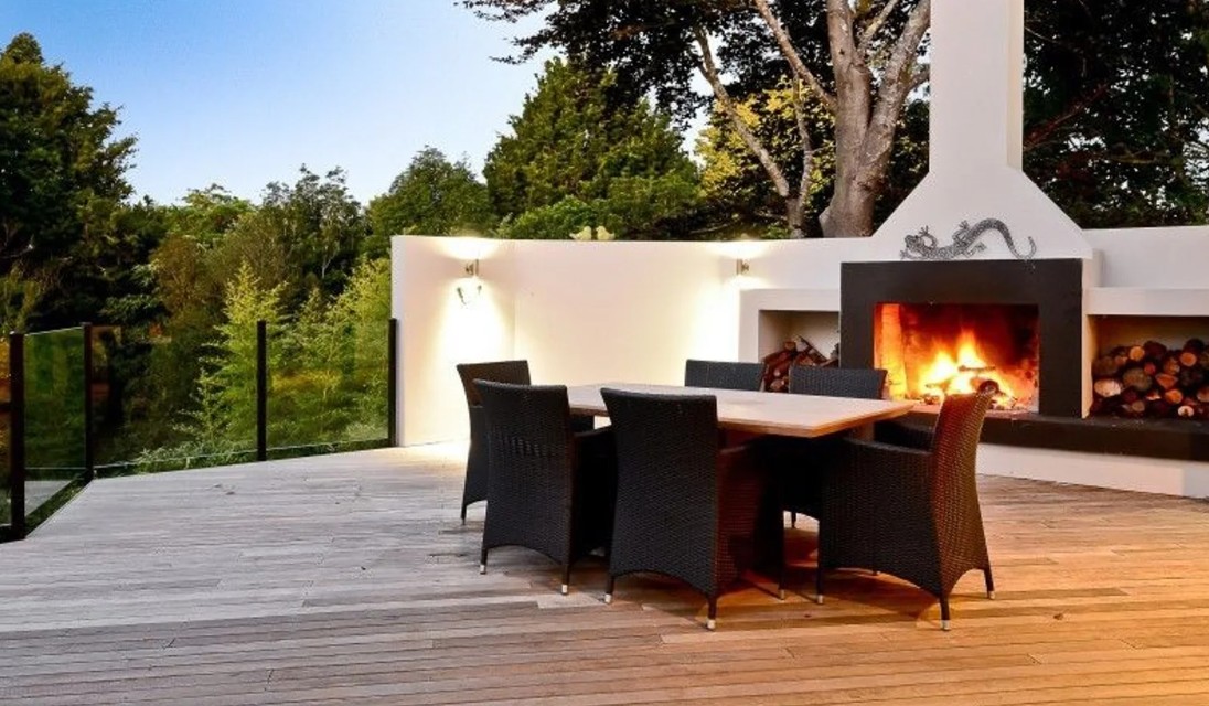 Outdoor fireplace and deck – the perfect spot to unwind, watch the sunset, and soak in the serene surroundings.