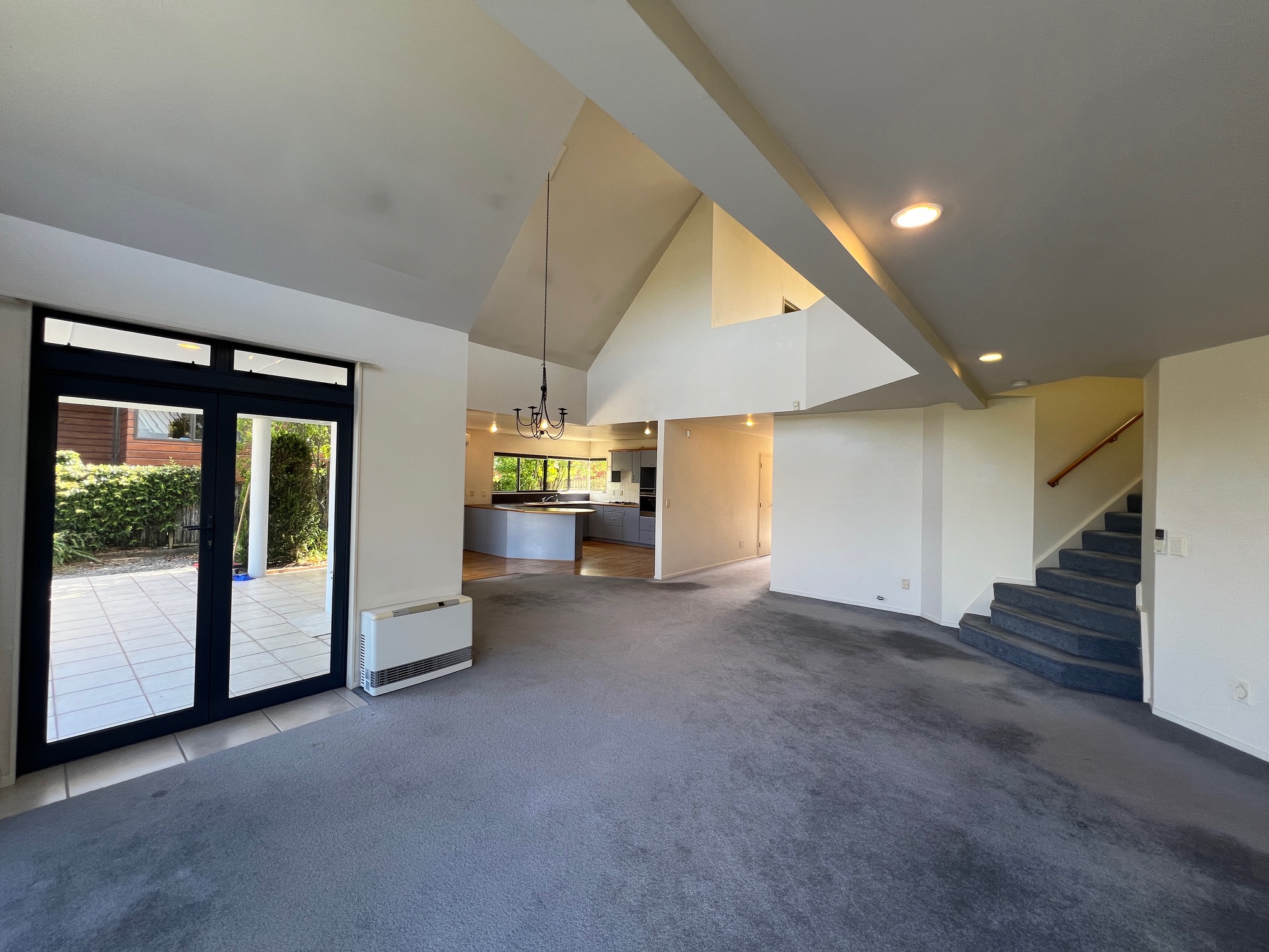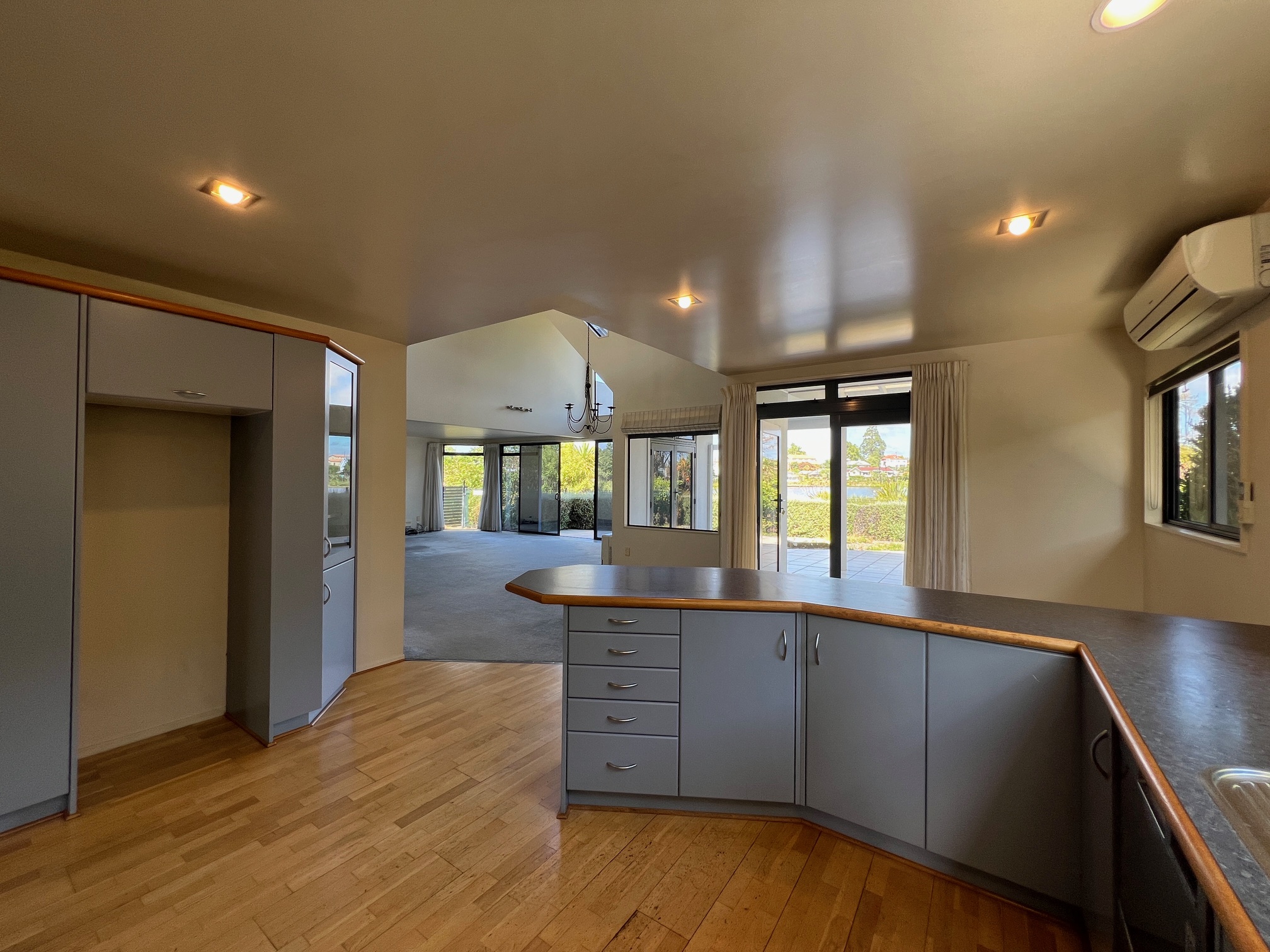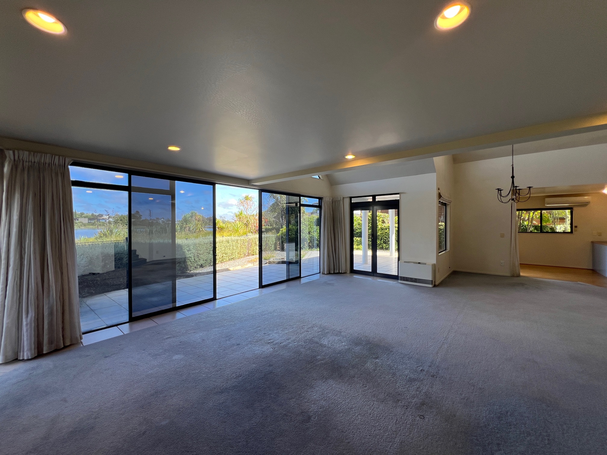 Open-plan kitchen, dining, and living with high ceilings flowing to a covered patio overlooking Lake Rotoroa.